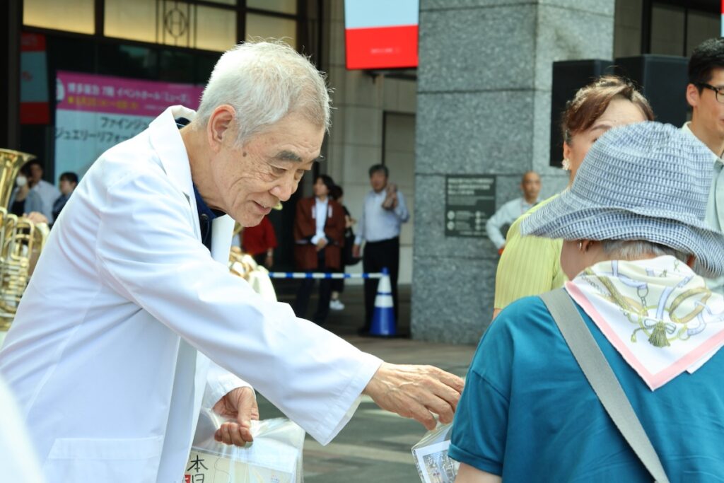 イベント中盤では、福岡市消防音楽隊の演奏に合わせて、柄本さんと渡辺さんが自ら来場者へチラシを手渡す場面も。思いがけない交流に、来場者からは笑顔がこぼれていました。