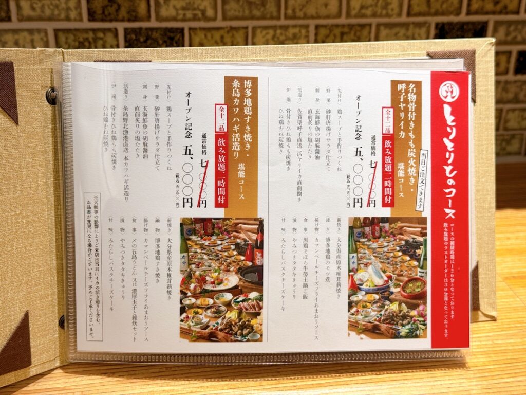 コース料理もあり、「名物骨付き炭火焼き・呼子ヤリイカ堪能コース」(7,000円)と「博多地鶏すき焼き・糸島カワハギ活造り堪能コース」(7,000円)のところオープン記念で5,000円になります。