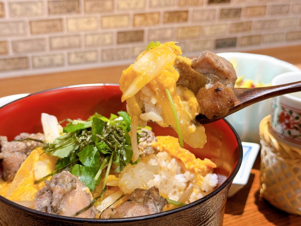 炭火で香ばしく焼いた地鶏を卵でとじ、鶏肉の弾力と香ばしさを堪能できる力強い一杯。
