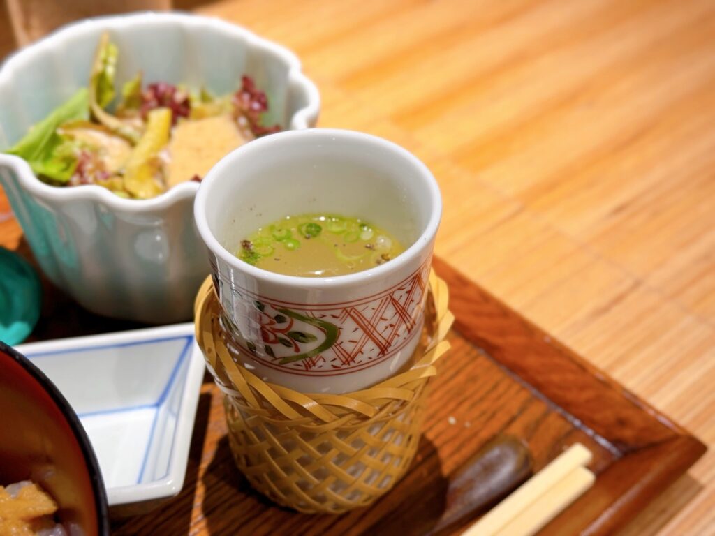 どちらもお刺身とサラダ、漬物、鶏つみれ入りの濃厚白湯スープがセット。ご飯の量も選べるので、その日の気分に合わせて楽しめます。