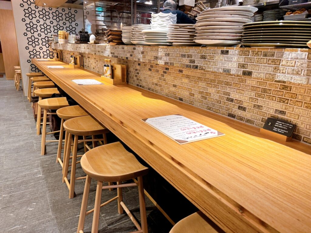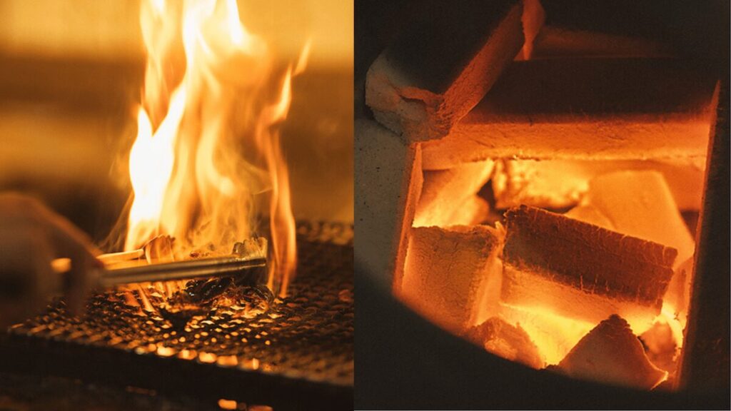 手前のカウンター席では目の前で炭火が上がり、調理のライブ感を楽しめます。ひとり飲みや仕事帰りの一杯にもおすすめ!