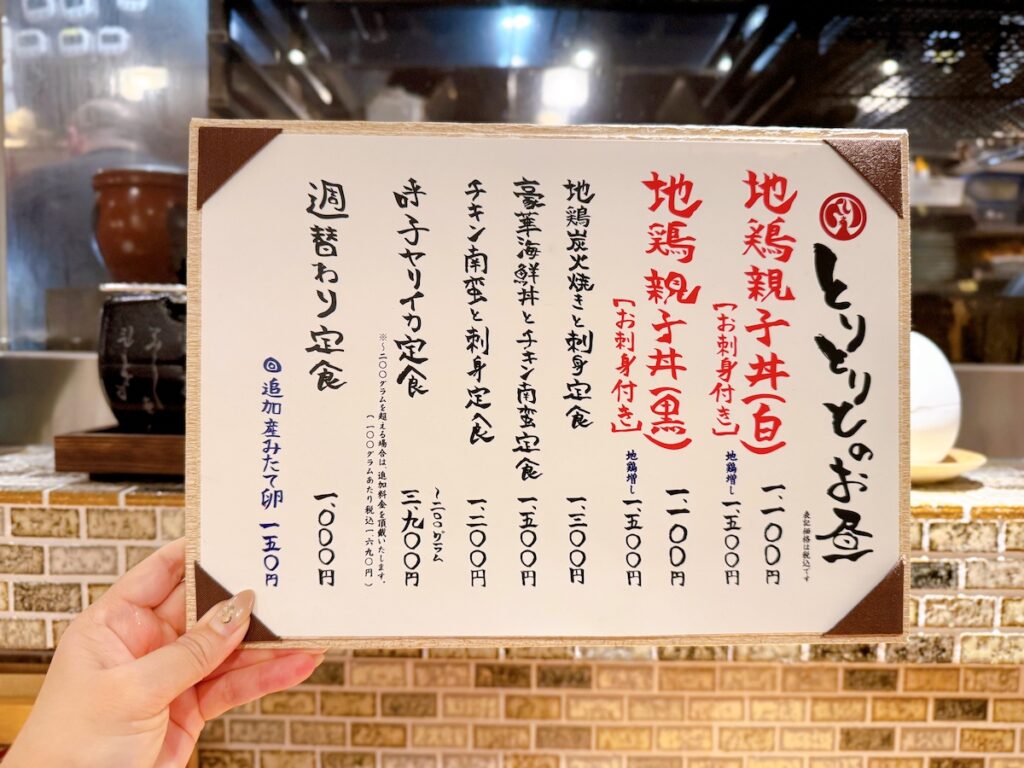 親子丼以外にも「地鶏炭火焼きと刺身定食」(1,300円)、「豪華海鮮丼とチキン南蛮定食」(1,500円)、「チキン南蛮と刺身定食」(1,200円)、「呼子ヤリイカ定食」(3,900円)「週替わり定食」(1,000円)と多彩なメニューが揃っています。昼から海鮮と鶏料理を同時に楽しめる贅沢さ。天神でこのラインナップは、地元民にとっても心強い選択肢になりそうですね!