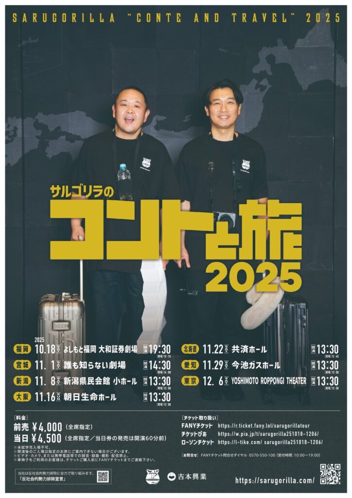 人気お笑いコンビ・サルゴリラ(赤羽健壱・児玉智洋)の全国ツアー「サルゴリラのコントと旅2025」が、10月18日(土)によしもと福岡大和証券劇場で開幕します!