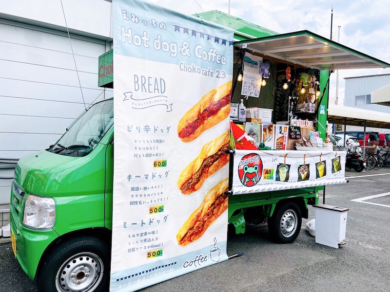 緑色な鮮やかなキッチンカー「chokocafe23」さんは、ここダイキョー弥永店のほか福岡県那珂川市の「中ノ島公園」や福岡市西区の「おやさいソラコ」など、日替わりで様々な場所に出店されています。