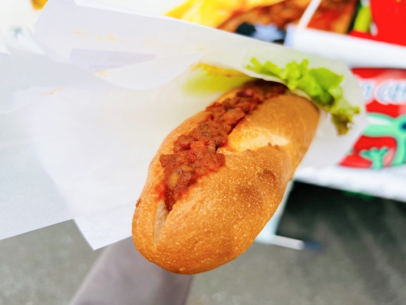 今回いただいたのは「ピリ辛ドッグ(600円)」。こちらのメニュー、”ピリ辛”と名前が付いていますが実はとっても辛い激辛ドッグ!コチュジャンや唐辛子などが入ったペーストはピリピリくる刺激がたまらない激辛好きにおすすめの逸品です。メニューの写真では見えませんが、中にはソーセージが入っていて食べごたえもバッチリ!