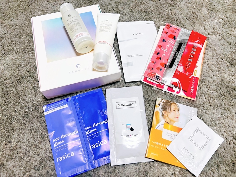 こちらが今回いただいたサンプル達。シャンプーやフェイスパックなど沢山いただきました!商品は毎月入れ替わるので、常に新しい商品に触れることができますよ。