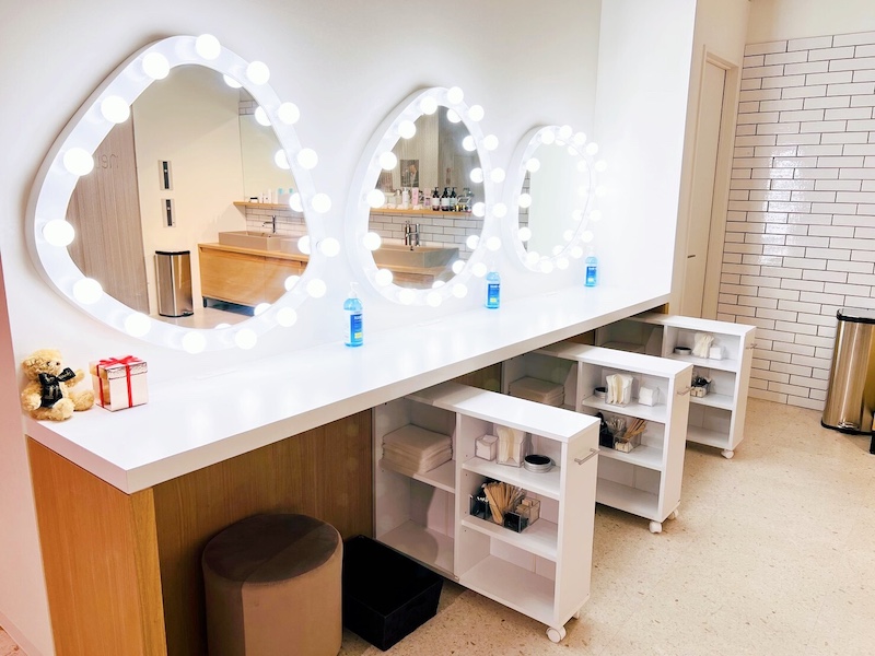 奥にはコスメやスキンケアを試す事ができるパウダールームがありますので、こちらで商品を自由に体験できます。