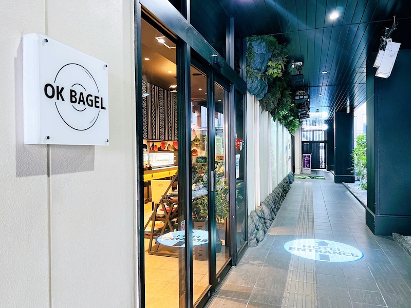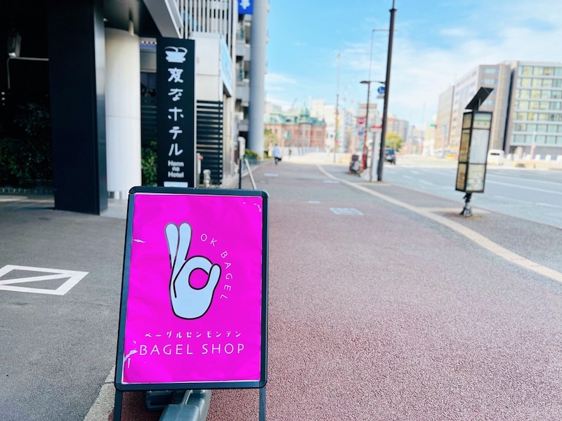 昭和通り沿いの「変なホテル福岡 博多」1階に位置するOK Bagel。地下鉄中洲川端駅からは約200mほどで徒歩2分とアクセスのしやすさも魅力的ですね。