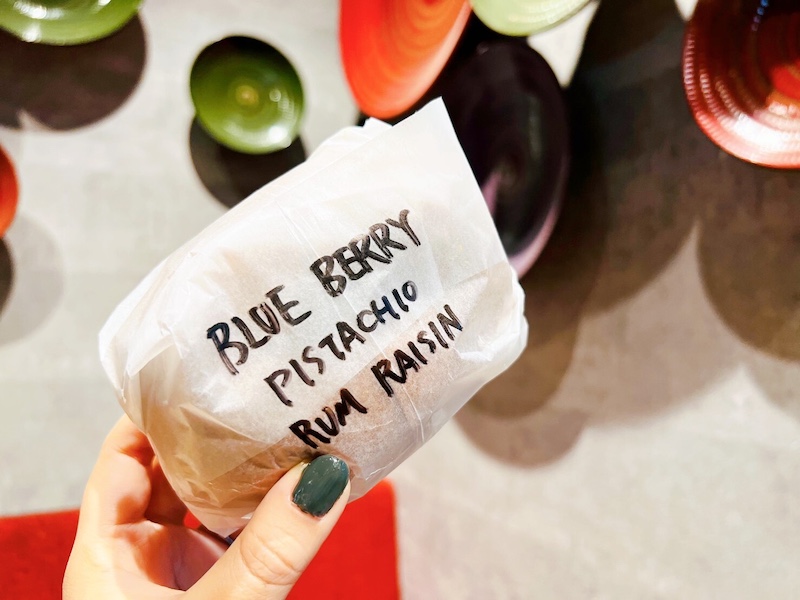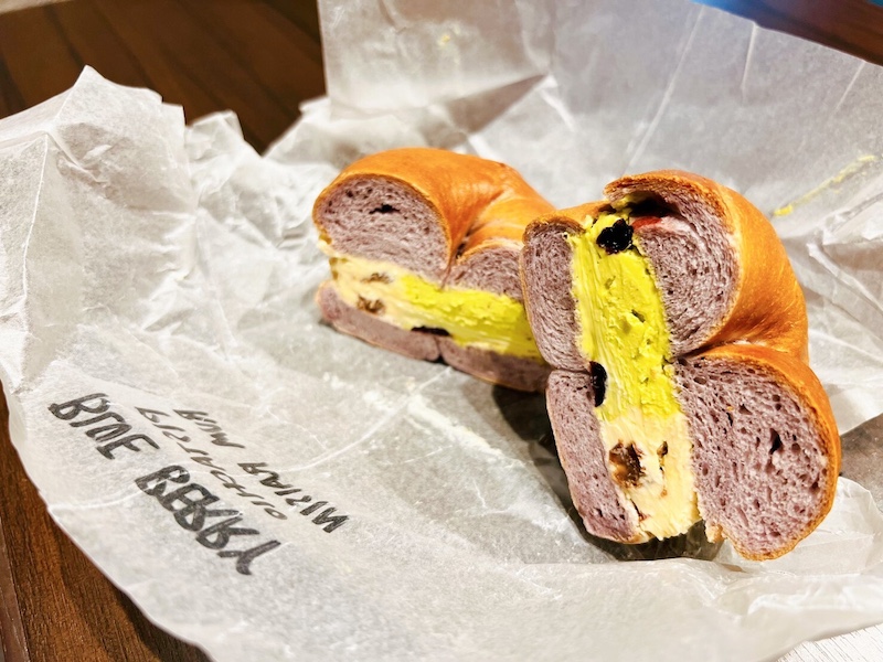 こちらはブルーベリーのベーグルにピスタチオとラムレーズンのクリームチーズ2種をサンドしてもらいました。