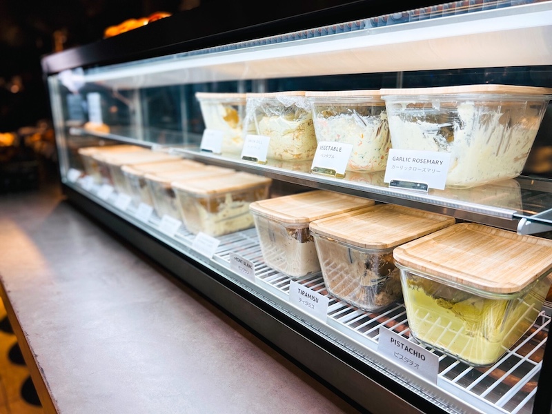 フレーバークリームチーズは定番のフレーバーから季節ごとに変わるフレーバーまで、約15種類が並んでいます。今の季節は「ラフランス」や「キャラメルスモア」、「ストロベリーショートケーキ」「モンブラン」などの限定フレーバーがありました!各種1カップ350円で購入することもできますよ♪