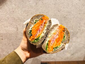 スモークサーモンの程よい塩味や新鮮なお野菜、ケッパーやガーリックローズマリークリームソースの香りが相まって人気の理由に納得するベーグルサンドでした!