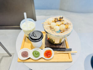粒餡・抹茶餡・みたらしと3種類がついてくるので、味変をしながら楽しむことができますよ。