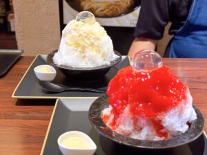 この店のかき氷に使用されているのは、“博多純氷”と呼ばれる福岡の天然水から作られた透明度の高い氷。削り方にもこだわりがあり、ふんわりとした口どけが特徴です。