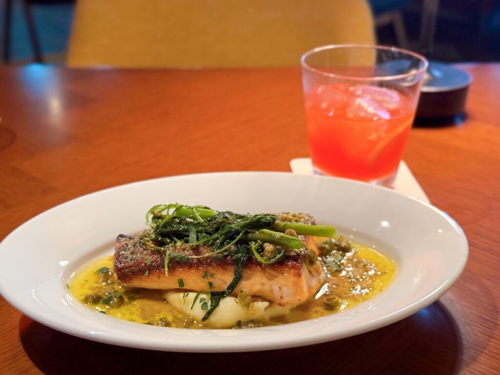 メインの「サーモンのソテー」は、皮はパリッと香ばしく、マッシュポテトと合わせると優しい味わいに。