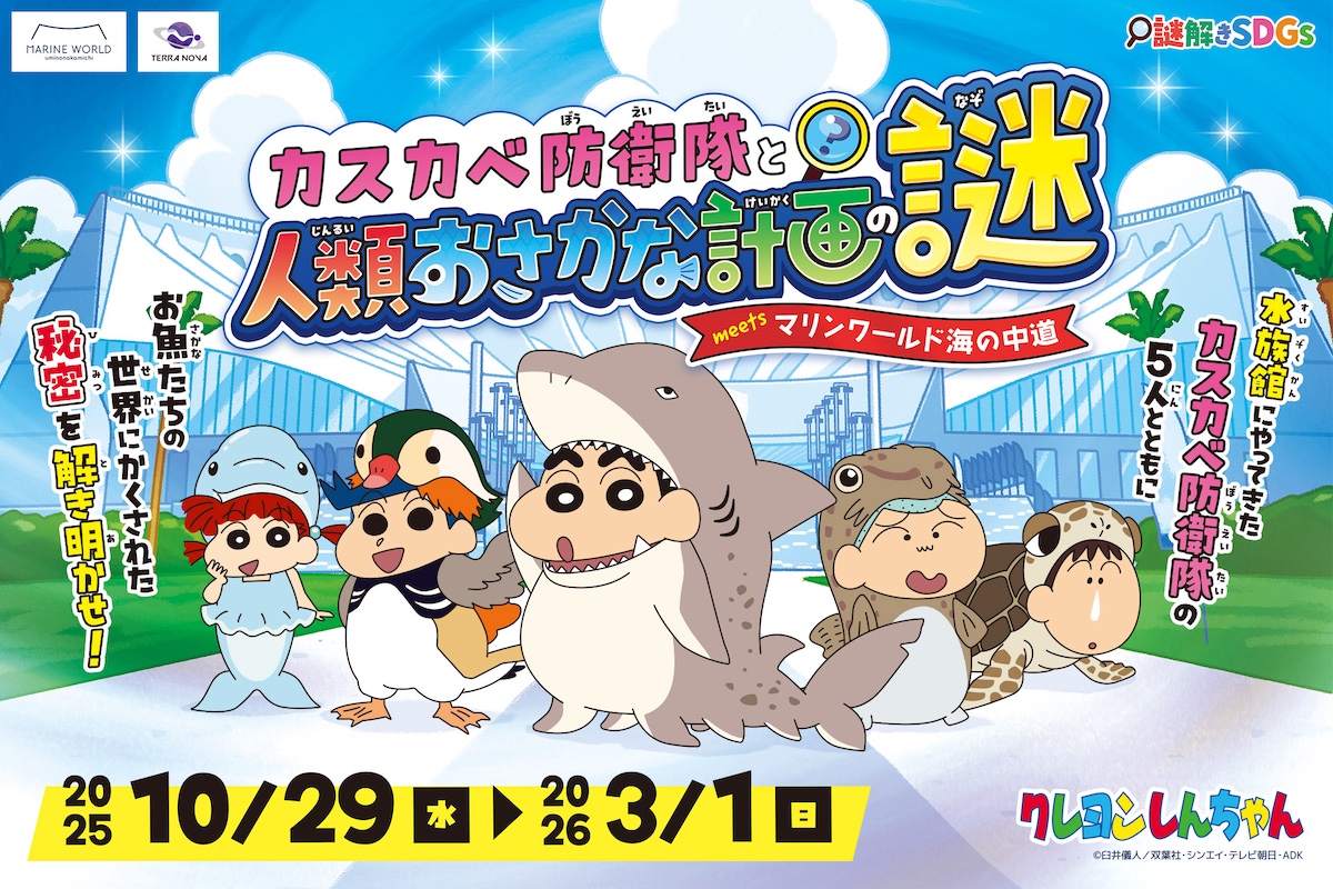 人気アニメ『クレヨンしんちゃん』とコラボしたリアル謎解きイベント「カスカベ防衛隊と人類おさかな計画の謎」が、本日2025年10月29日(水)より、マリンワールド海の中道(福岡市東区)にて開催されます。