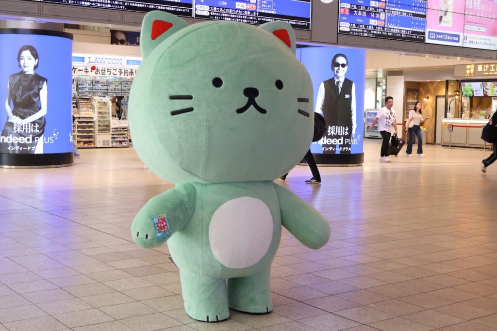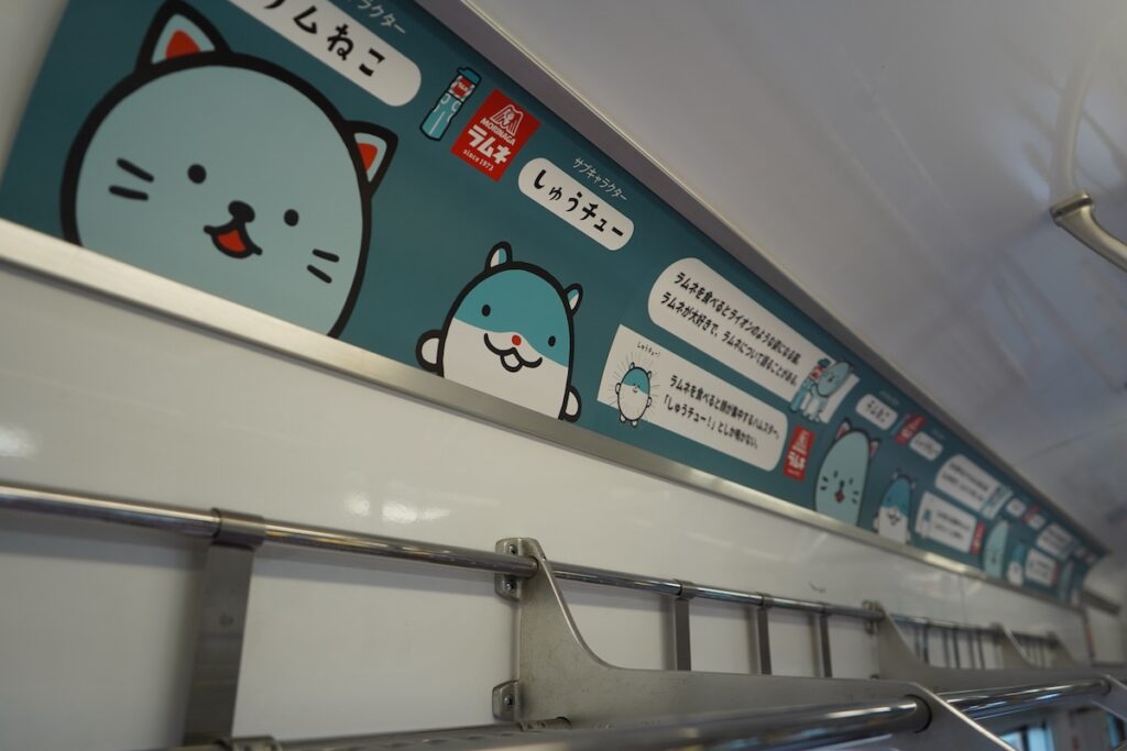 車内の広告枠は森永ラムネのグリーンのカラーリングとラムねこで独占されています(10月17日~10月31日の2週間限定)。サブキャラクターの“しゅうチュー”も加わり、かわいらしいキャラクターがぶどう糖で集中をサポートしてくれますよ。