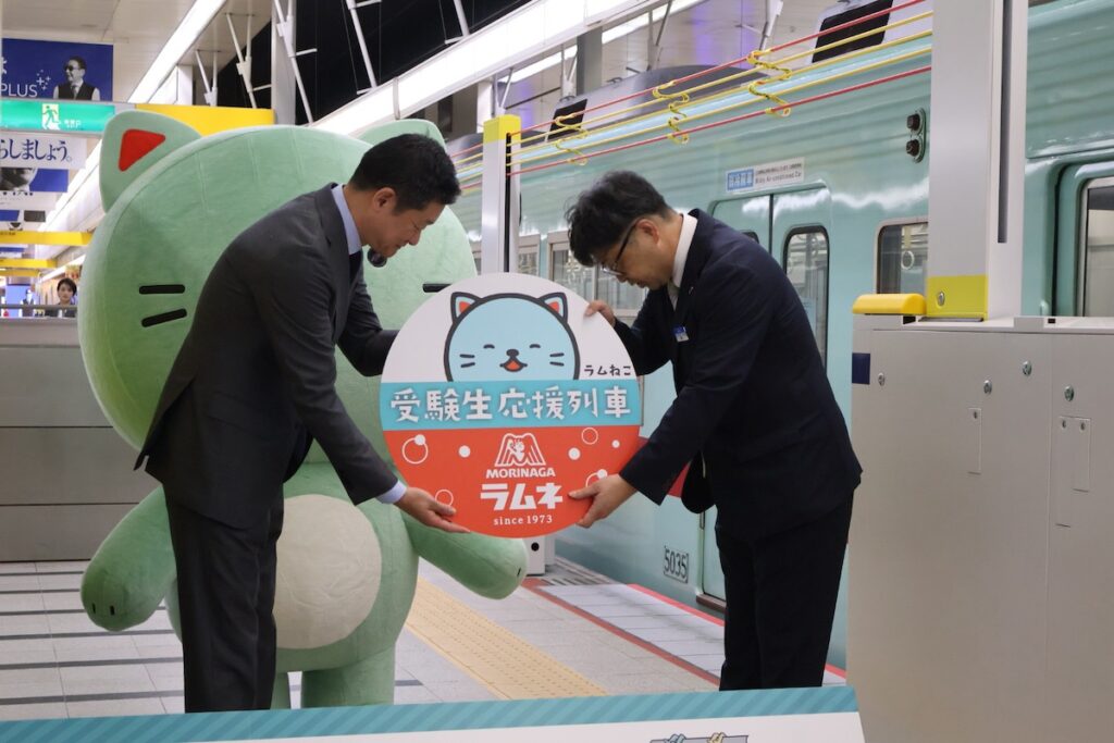 式典では、「ラムねこ」ヘッドマークの授与やフォトセッションが行われ、福岡から未来を担う受験生へエールを送る限定列車の運行開始を見守りました。