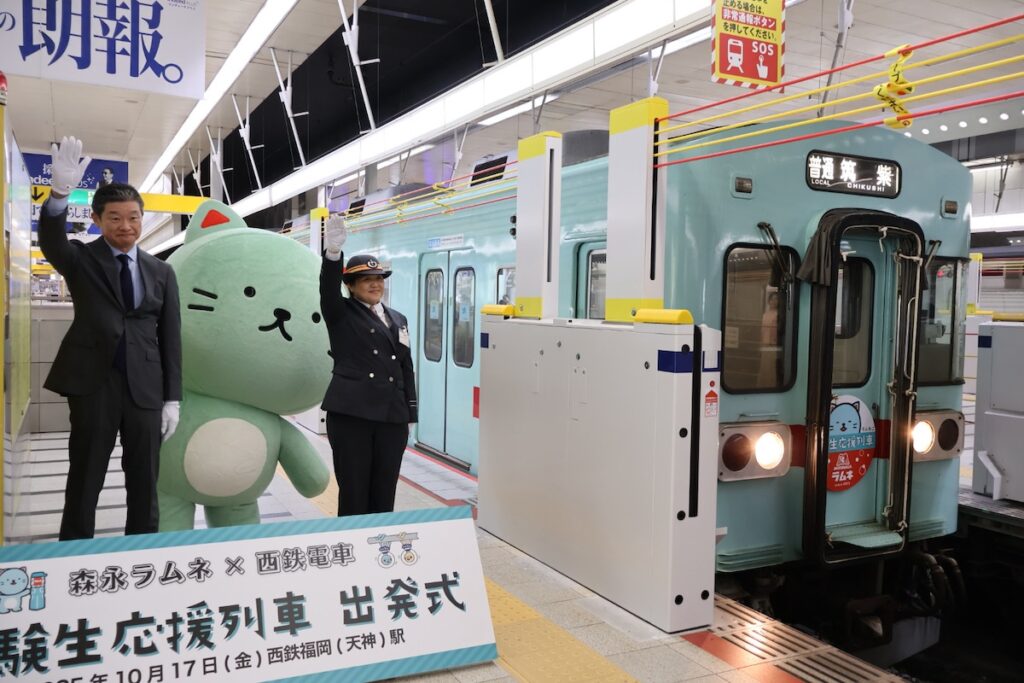 今年デビュー50周年を迎えた西鉄5000形が、森永ラムネの公式キャラクター「ラムねこ」仕様の特別装飾をまとい、西鉄福岡(天神)駅を出発。車内は受験生へのエールで満たされています。