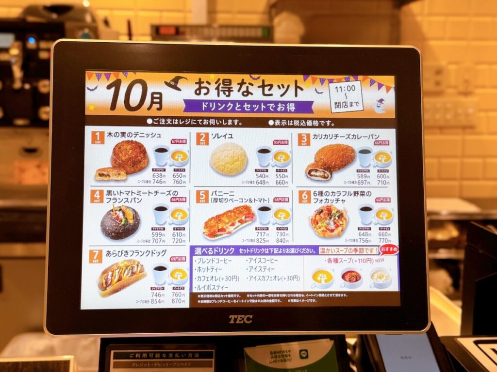 パン、サンドイッチ、またはトーストのいずれか1品と対象ドリンクのセットで、通勤前にも立ち寄りやすいのがうれしいですね!11時から閉店まではパンとドリンクのお得なセットが月替わりで提供されています。