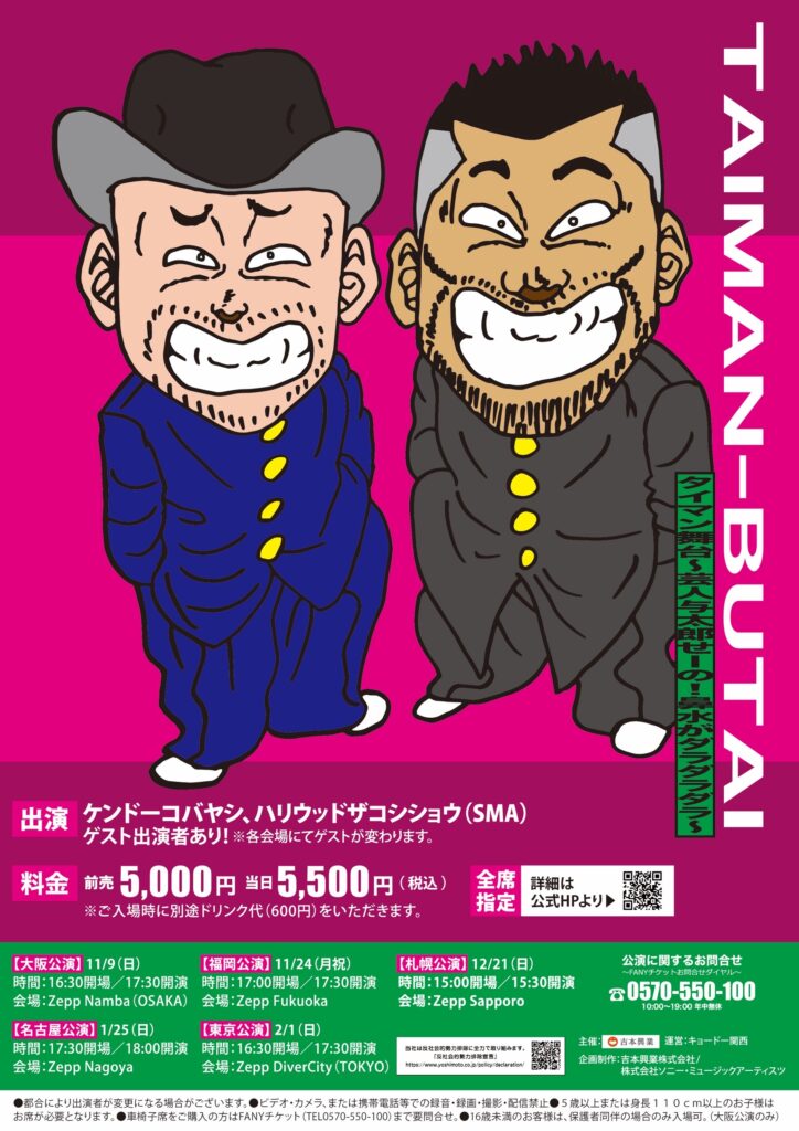 お笑い界の鬼才、ケンドーコバヤシさんとハリウッドザコシショウさんによる伝説のツーマンライブ『タイマン舞台』が、全国Zeppツアーとして復活。