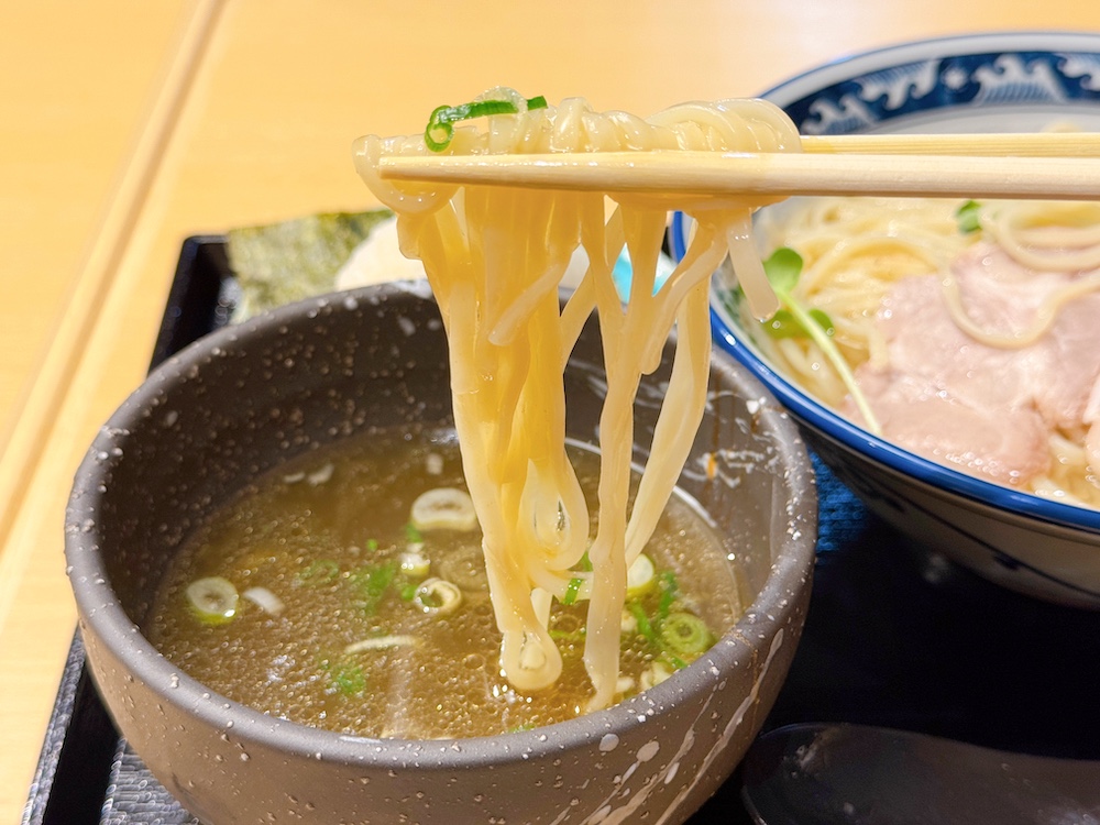 この麺を温かい鶏出汁のつけ汁に付けていただきます。冷たいスープから温かい出汁に移すとなんともいえない温度差で絶妙なおいしさを生み出します。