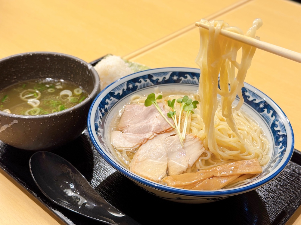 この店の特徴はのどぐろや鶏といった食材を惜しみなく使ったこだわりの出汁です。透明感があり洗練されたスープから立ち昇る芳醇な香りと全粒粉の細平打ち麺。この特注麺が繊細な出汁をしっかりと絡ませ、絶妙な一体感を生み出します。