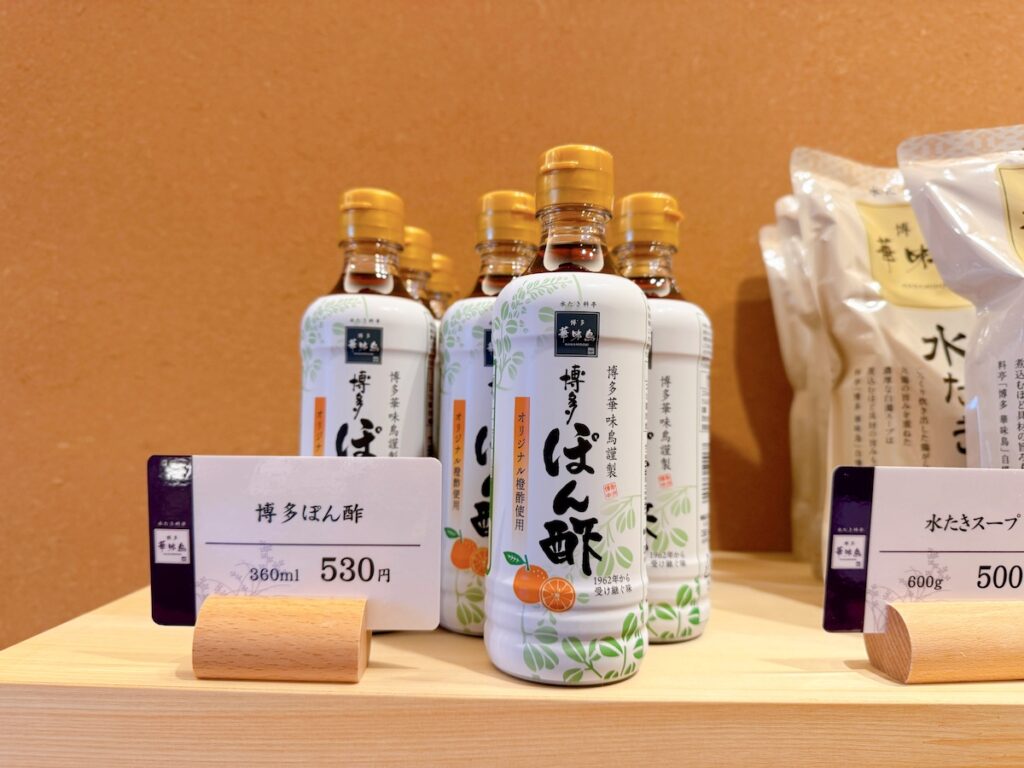 さらに、1階にはお土産コーナーも併設されていて、お食事にも使用されている自家製ぽん酢や柚胡椒をはじめご家庭で華味鳥の味を楽しめる商品を購入できます。
