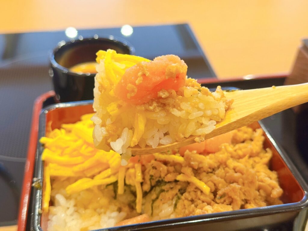 御膳の主役の一つ、ミニ明太鶏そぼろ重は、3色の色合いが美しい一品。九州産華味鳥を使用した甘めの鶏そぼろの上に、辛さを抑えた深みのある味わいの自家製明太子が片腹贅沢に乗せられています。このプチプチ感のある明太子と甘めのそぼろの相性は抜群で、お昼からこんな贅沢なメニューを一人で楽しめるのは本当にうれしい……!