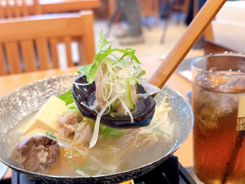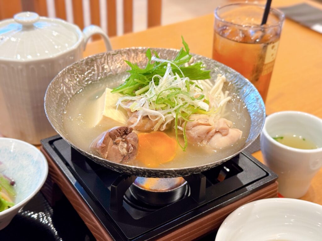 小鍋の水たきには、食べ応えのあるゴロッとした華味鳥がたっぷり。優しいスープがしっかりと鶏肉に絡みつき、極上の博多の郷土料理を満喫できます。