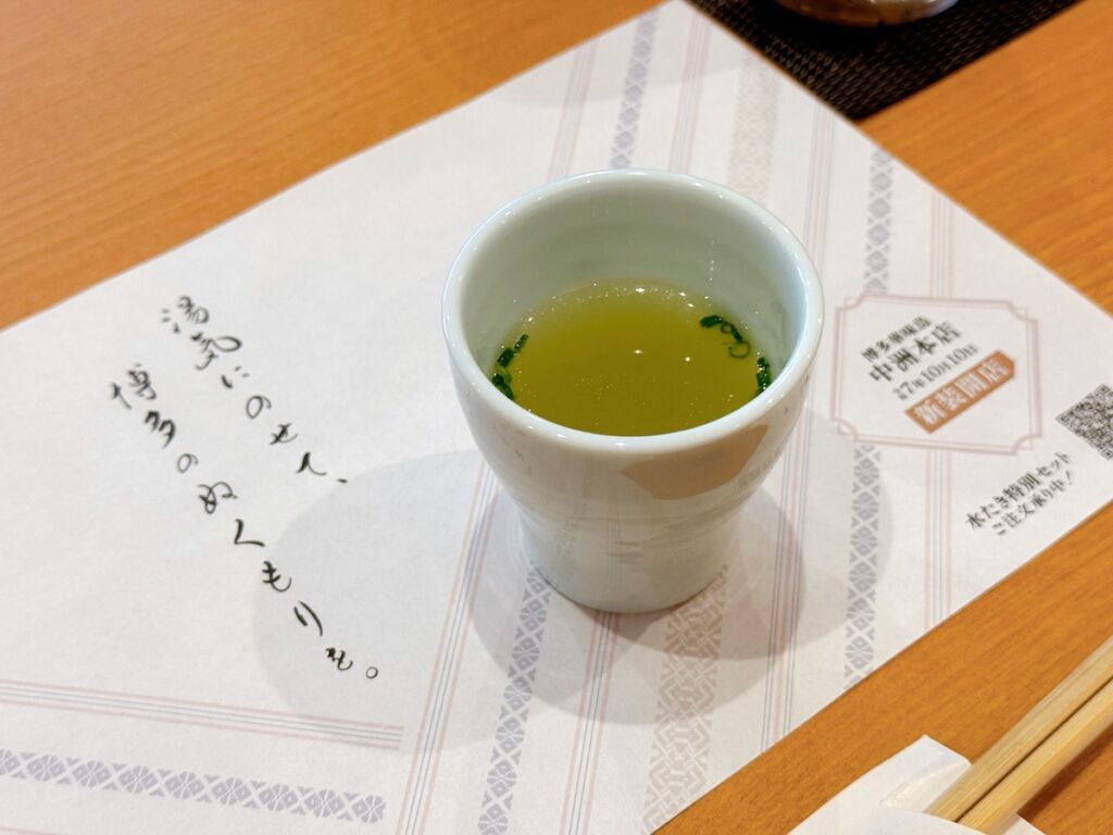 博多流に、まずはスープを一口。創業者が鶏骨の鮮度、部位、水、温度、時間にこだわり抜いて作り上げたという白濁のスープは、一口飲むと華味鳥の優しい味わいがじんわりと口いっぱいに広がります。