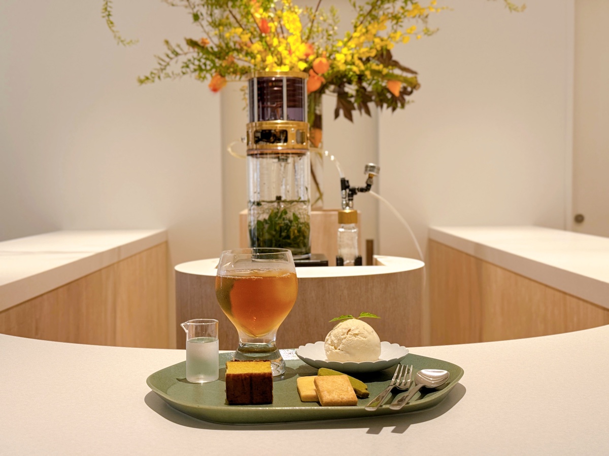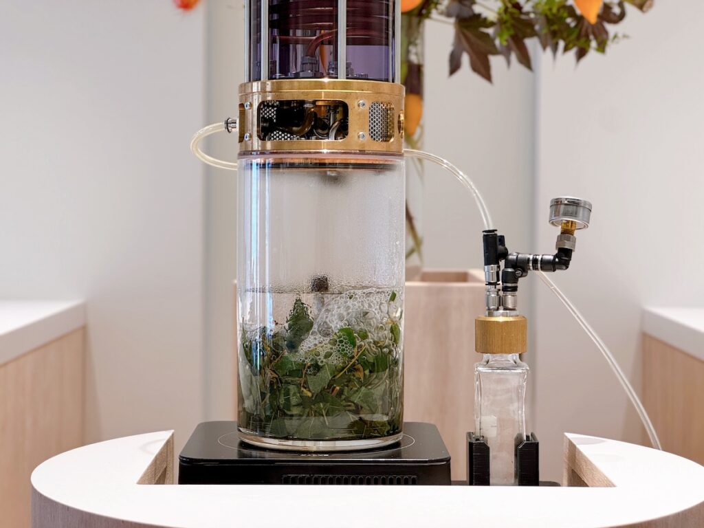 提供されるメニューに使われている蒸留水は、植物を煮出して気化させ、その蒸気を冷やして香りの成分だけを抽出するというとても繊細な作業です。オーナーさんが丁寧に説明してくださり、見た目は普通の水なのに、口に運ぶと植物の香りが鼻から抜けるという不思議な体験に驚きました。