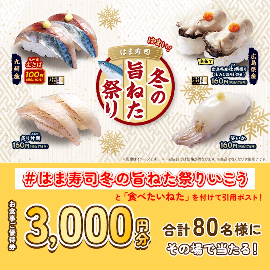 はま寿司公式Xでは、抽選で80名様に3,000円分のお食事優待券が当たるキャンペーンも実施されます(11月19日(水)まで)。この機会に、はま寿司の「冬の旨ねた祭り」で、心ゆくまで旬の味覚を堪能されてはいかがでしょうか。