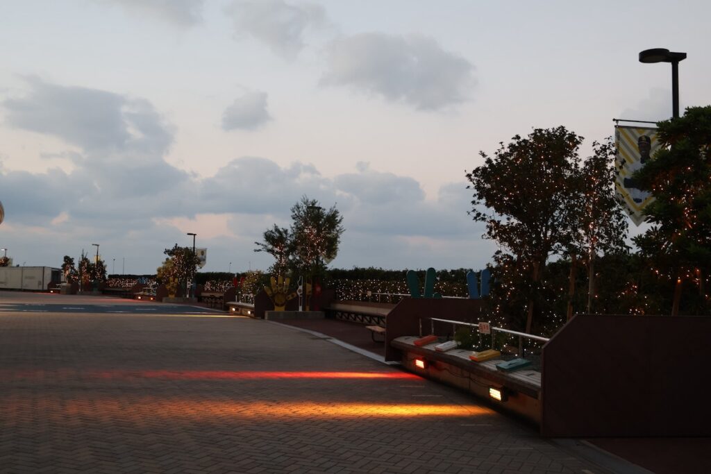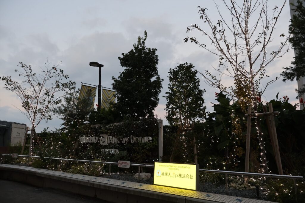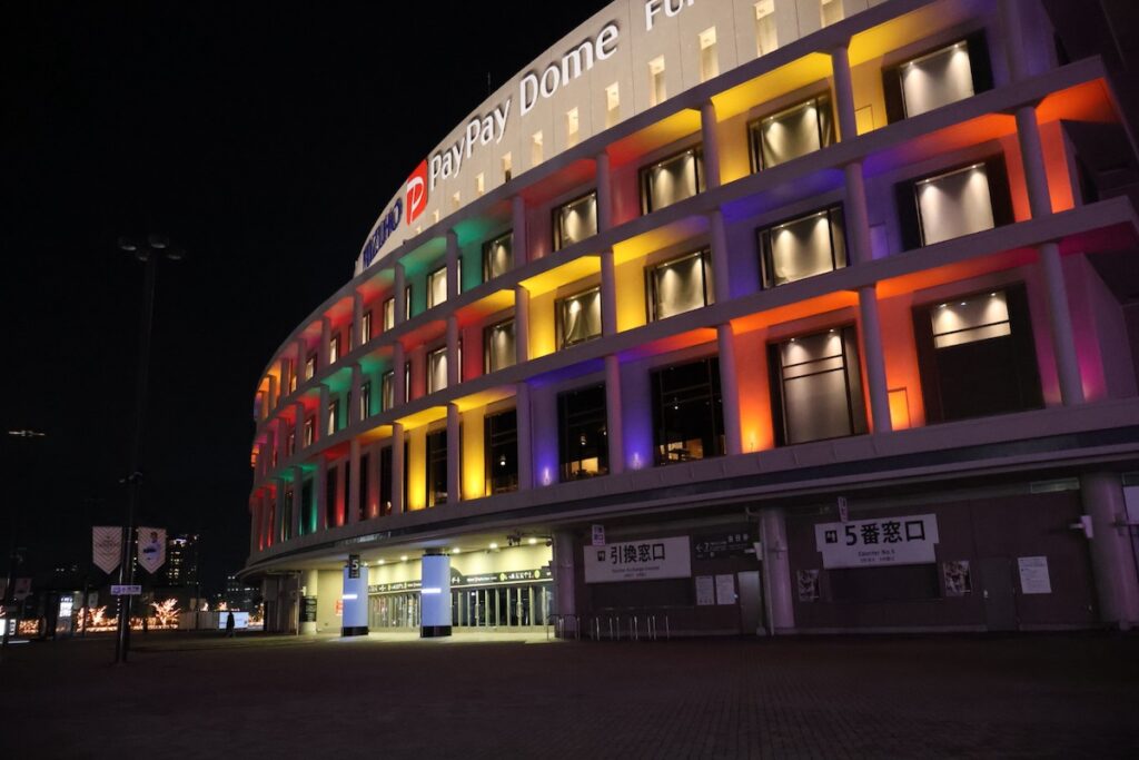 さらに、みずほPayPayドーム正面の花文字エリアにもイルミネーションが拡大され、ドーム全体を包み込むように色とりどりの光が輝きます。11月中旬の17:00は少しずつ陽が落ち始めたころ。5ゲート前からぐるりと右回りに回ってみました。