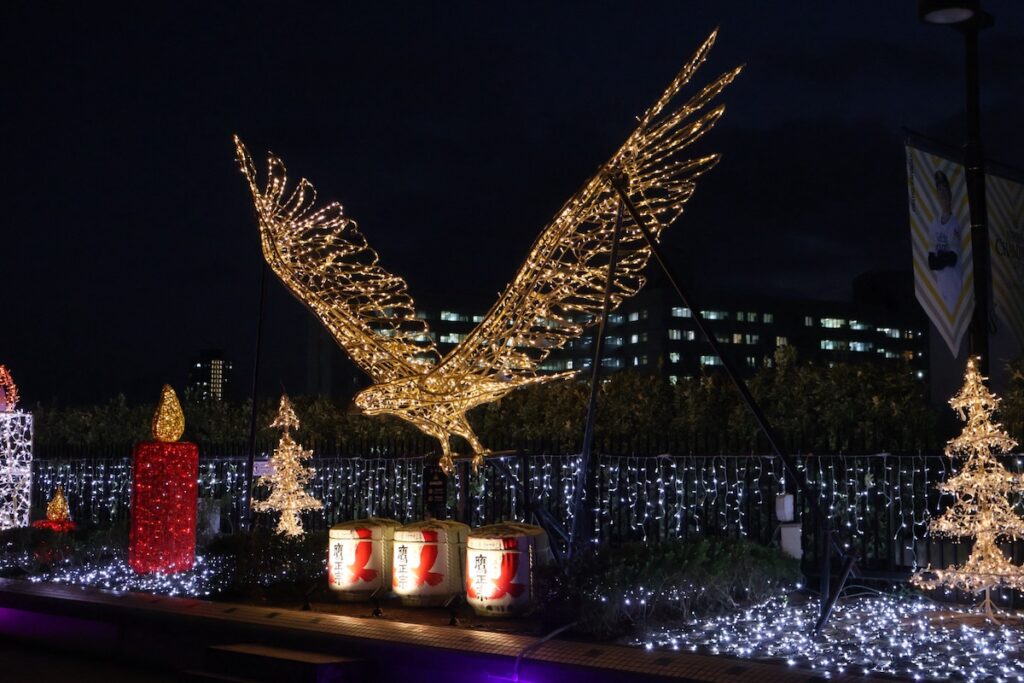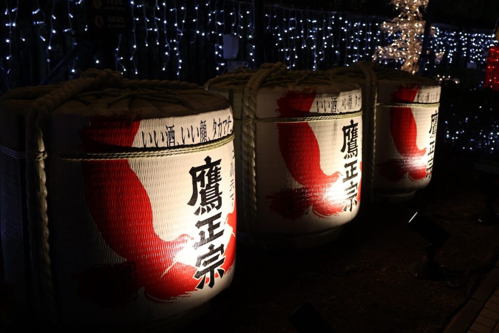 そのなかでも一際目立っているのがこちらの大きな鷹のイルミネーション。下には大きな酒樽が3つ並んでいます。