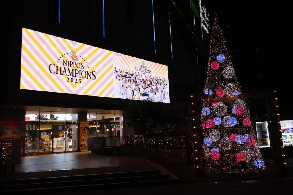 今年は高さ7.5mの巨大オブジェに加え、ホークス優勝の祝勝会で飾られた酒樽の装飾など、ファンにはたまらない限定スポットが登場。初日にはホークス選手が登壇する点灯式も実施される特別な冬の風物詩をレポートします。