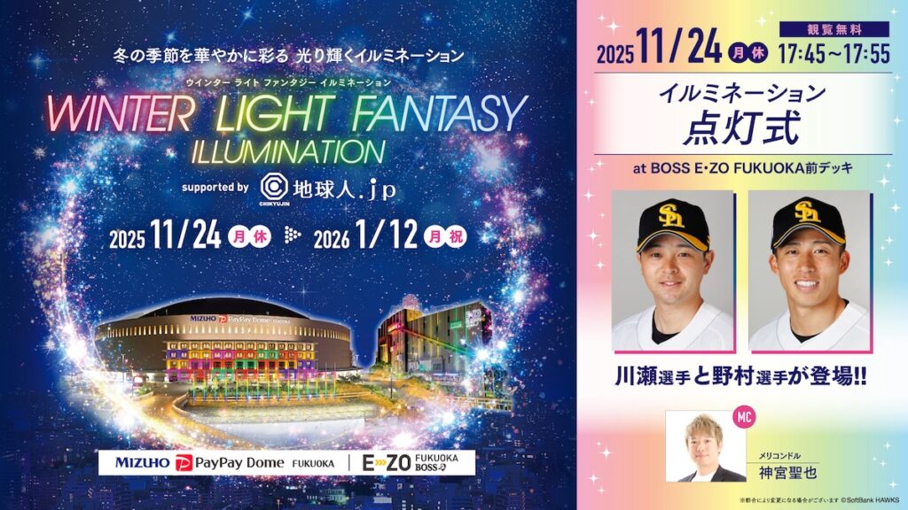 「WINTER LIGHT FANTASY ILLUMINATION supported by 地球人.jp」は、福岡ソフトバンクホークスの本拠地を舞台に繰り広げられる、福岡限定のロマンチックな光のイベントです。開催期間は2026年1月12日(月・祝)まで。夜のBOSS E・ZO FUKUOKAとみずほPayPayドーム周辺で、この冬だけの特別な幻想的な光の世界をぜひ体感してみてはいかがでしょうか?