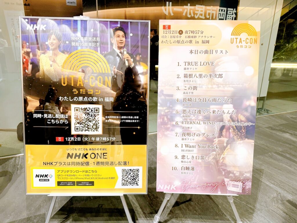 NHK福岡放送局 開局95周年を記念し、音楽番組『うたコン』の公開収録が11月27日に福岡市民ホールで開催されました。テーマは「わたしの原点の歌 in福岡」。藤井フミヤさん、氷川きよしさん、海援隊ら豪華アーティストと、地元出身の梅谷心愛さんが集結した熱狂のステージをレポート!司会の谷原章介さんや出演者の福岡愛あふれるコメントと、感動のセットリストをご紹介します。