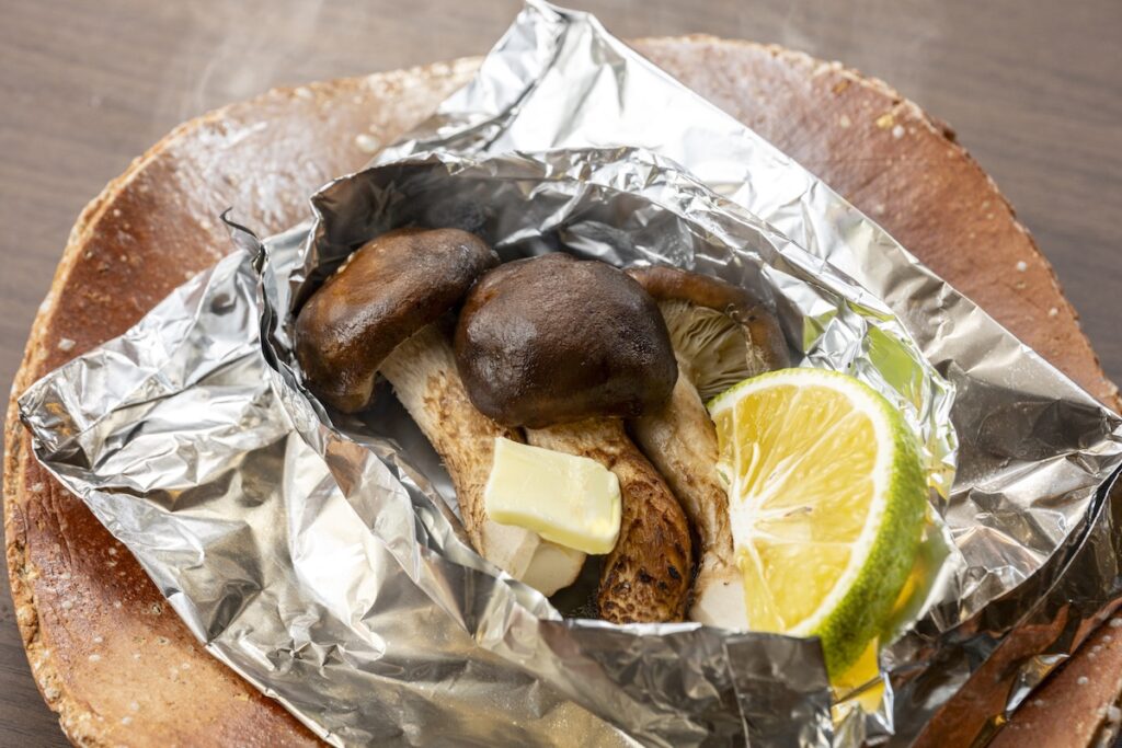 「ホイルバター焼き」はほんのり塩味の効いたバターと秘伝の醤油だしが松きのこに染み込んでいて、香ばしさがダイレクトに伝わってきます。