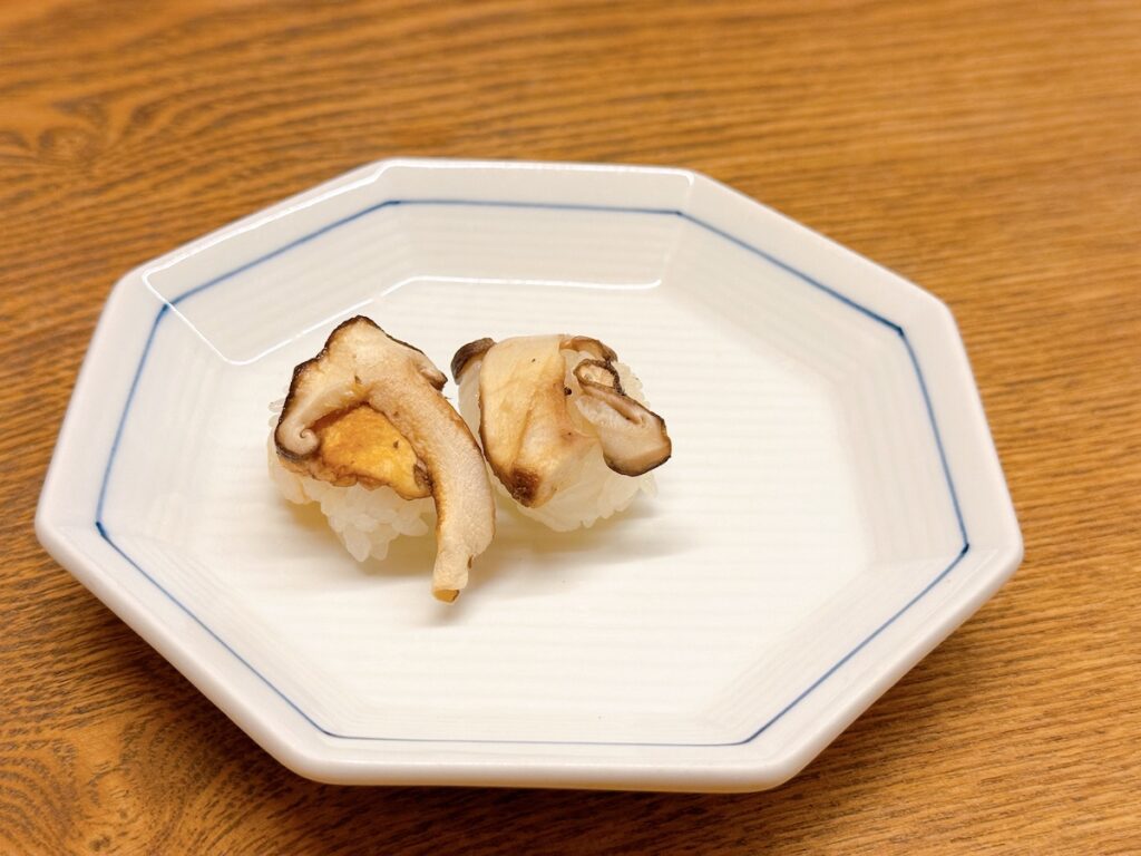 全セット共通で提供されるのが、「松きのこのホイルバター焼き」と「松きのこの握り寿司」です。こちらも松きのこの魅力をダイレクトに感じられる逸品!