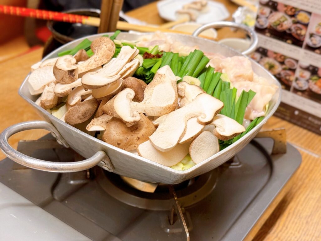鍋に使用するスープまで松きのこから出汁を取るこだわりで、やさしい風味と芳醇な香りが全体を包み込みます。今回は、福岡名物のもつ鍋を含む3種類のセットをいただきました。