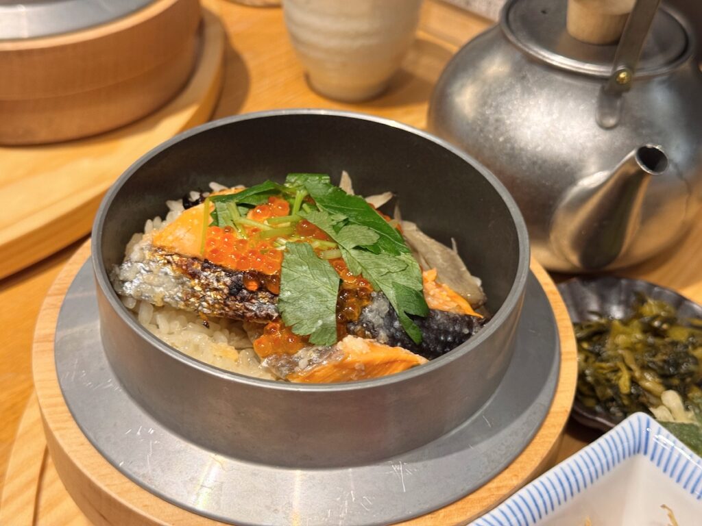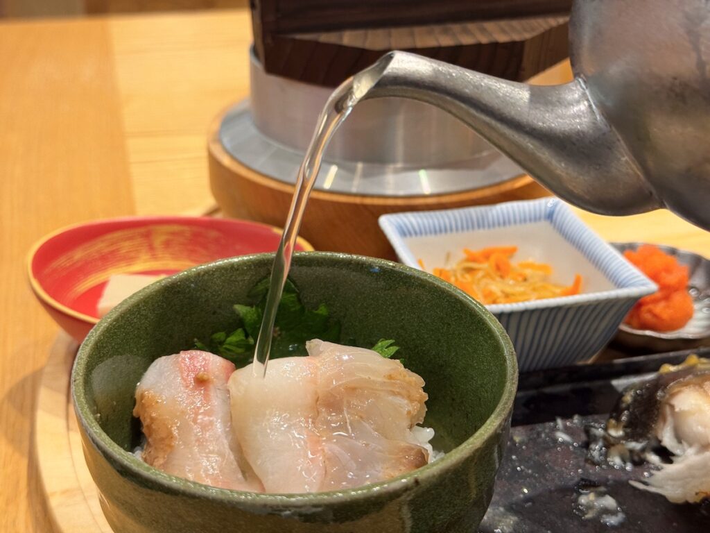 お店のおすすめの食べ方は、まずはおかずで羽釜ご飯を堪能し、その後、残ったご飯に出汁をかけてだし茶漬けを楽しむというスタイル。たっぷりとご飯があるので、何度でも楽しめるのも魅力的です。濃厚な銀鱈や胡麻ダレの旨味が少し残ったご飯に熱々の黄金出汁を注ぐと、上品な香りが立ち上がり、一気に優しい味わいに変化します。