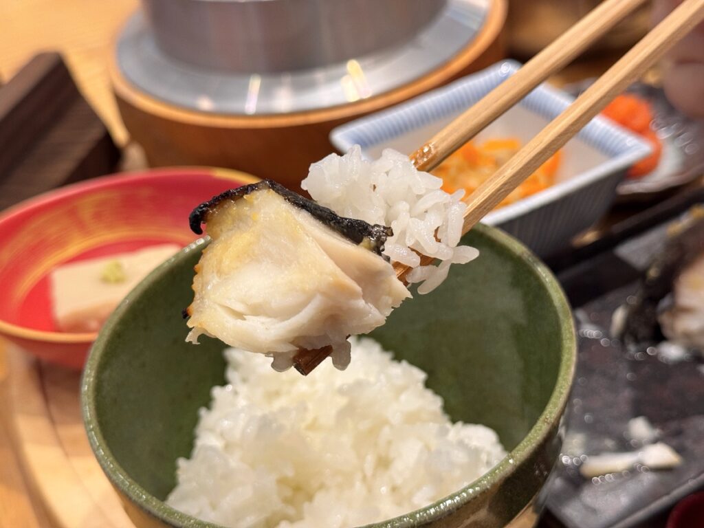 まず羽釜ご飯に銀鱈の西京焼きを乗せてそのままいただきます。炊き立てからベストなタイミングで運ばれてきたご飯は、つややかで粒がしっかり立っています。口に運ぶと、お米本来の優しい甘みがふわりと広がり、強い火力で炊き上げられた粒の食感がたまりません……!噛むほどに旨味が増すご飯そのものがおいしくて箸がとまらなくなります。
