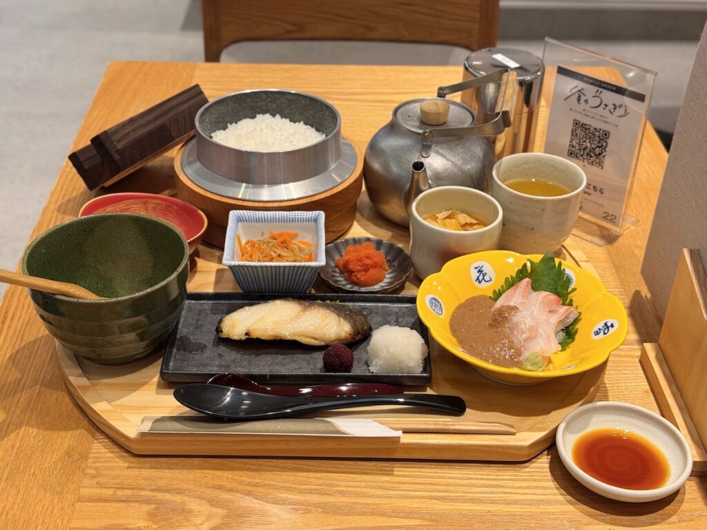 今回いただいたのは「銀鱈の西京焼きと鯛の胡麻ダレ御膳」(2,680円)。メインのおかずに加えて、羽釜ご飯、こだわりの出汁、小鉢(きんぴらごぼうなど)、お口直しのやまももなどがセットになった豪華な御膳です。