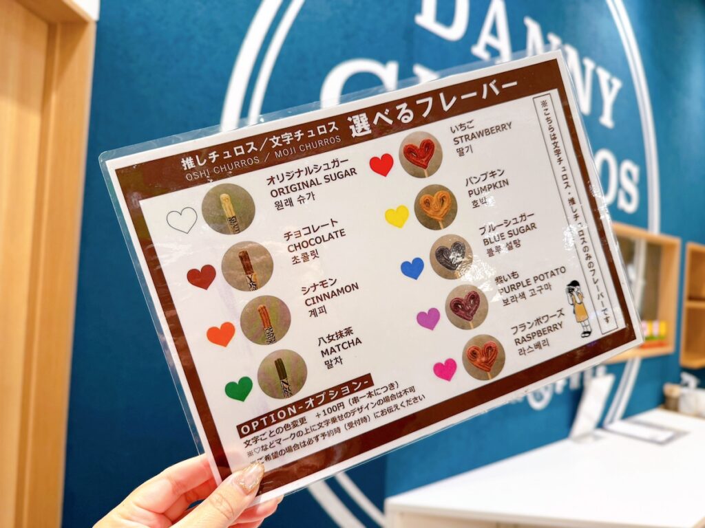 推しチュロス:10種類のフレーバーや色から選ぶことができるため、推しの担当カラーに合わせて作るのもおすすめです。名前だけでなく、下にハート形のモチーフを入れるオプションもあり、自分だけのオリジナルデザインが楽しめます。