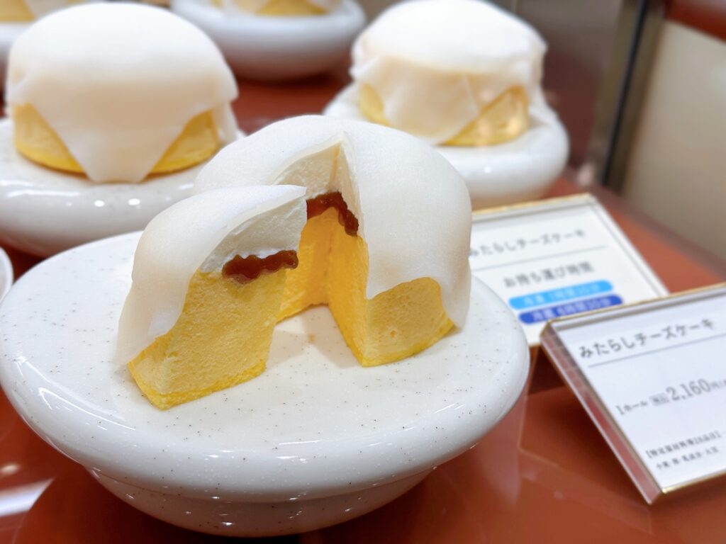 和と洋のハイブリッドとして早速人気を集めているのが「みたらしチーズケーキ(1ホール2,160円)」です。やわらかな求肥をまとったチーズケーキの中にみたらしが閉じ込められています。