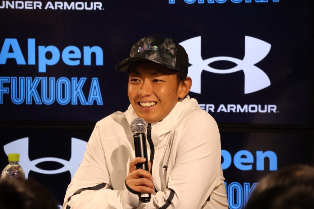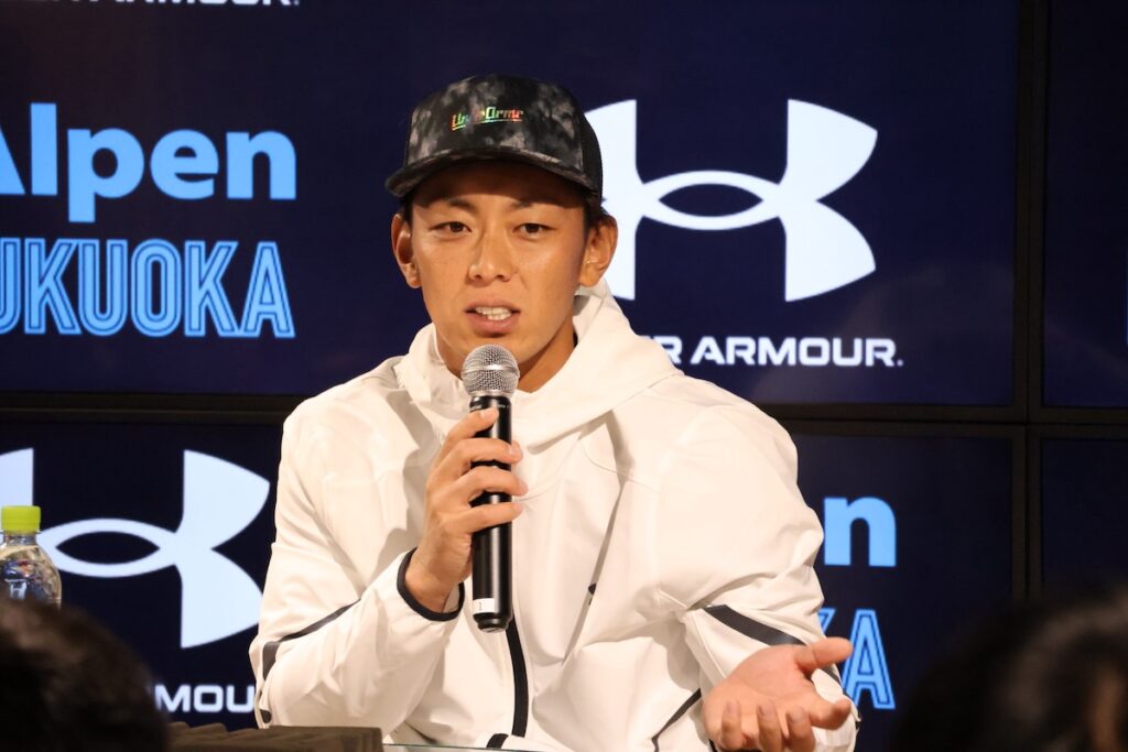 全身アンダーアーマーの最新ウェアをスタイリッシュに着こなして登場した今宮選手。この日の私服も同ブランドで揃えるほど愛用しているそうで、そのこだわりからトークはスタートしました。