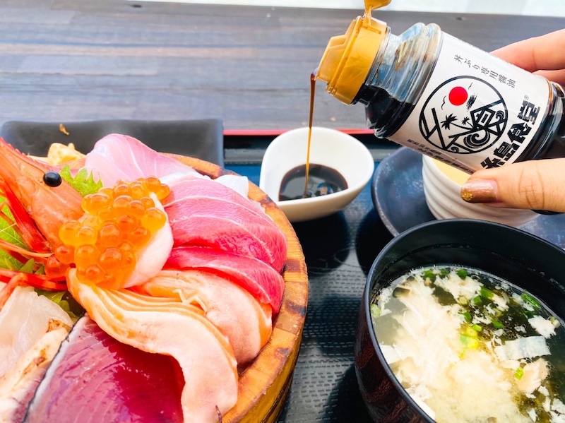 糸島食堂で使われているお醤油は糸島の「北井醤油」。どんぶり専用のお醤油、胡麻だれ醤油、こいくちのお醤油と3種類あり、甘めの味わいが特徴です。