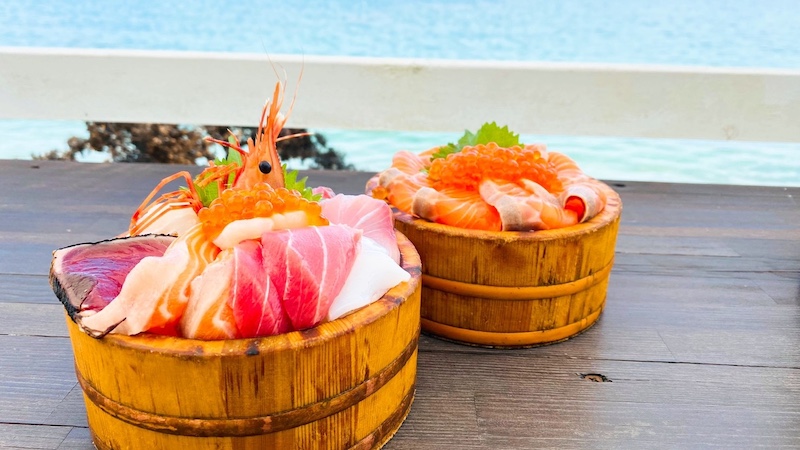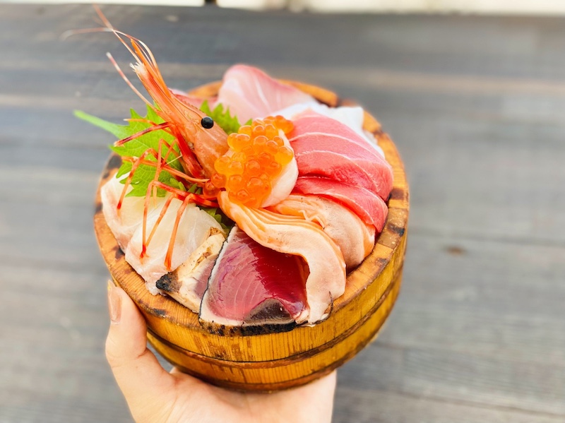 こちらは人気の「海鮮丼」。その日のおすすめの海鮮が桶からはみ出んばかりに盛られています。最高のロケーションをバックに思わず記念撮影をしたくなりますね。お刺身もひとつひとつが分厚くて食べごたえも満点です!