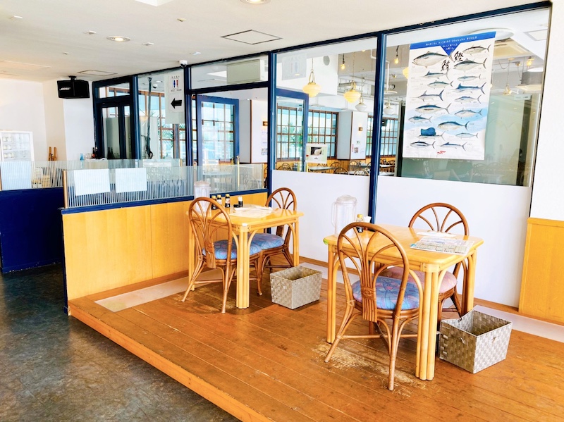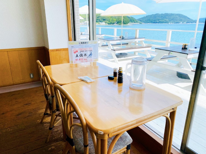 こちらはテラス席。グループにはテーブル、おひとり様やカップルには海に向かったカウンター席がおすすめです。