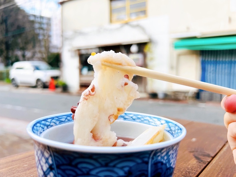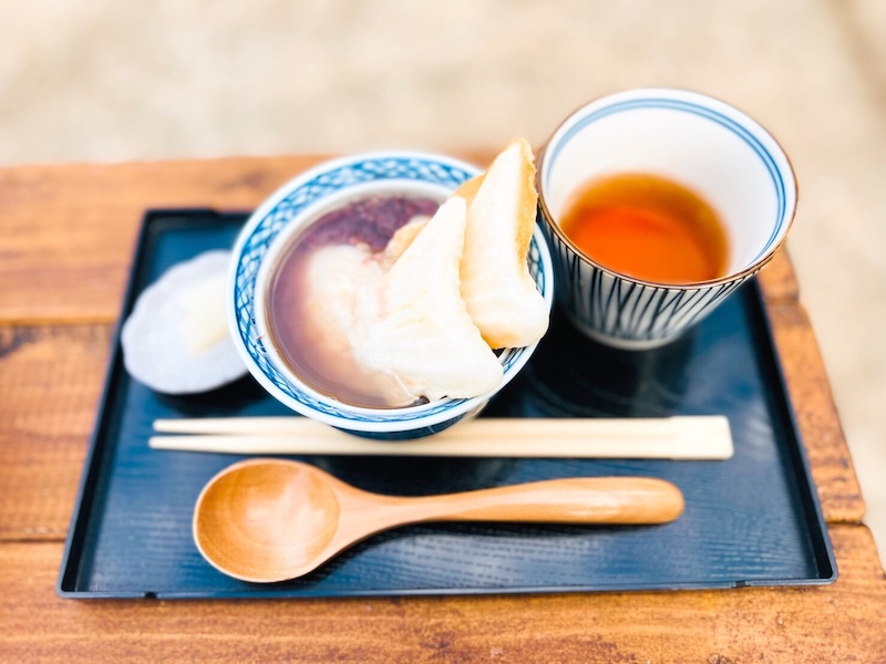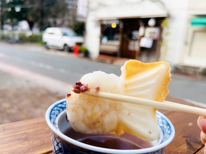 こちらは冬のおすすめ、平日限定の「たいヒレぜんざい(2ヒレ入り420円)」。ヒレ型のお餅が入っているぜんざいです。